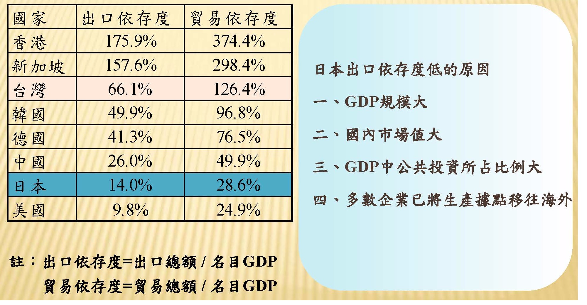 出口依存度 = 出口金額 ÷ GDP,台灣是66%,貿易依存度 = (出口+進口) ÷ GDP ,台灣是126%,都比日本高。