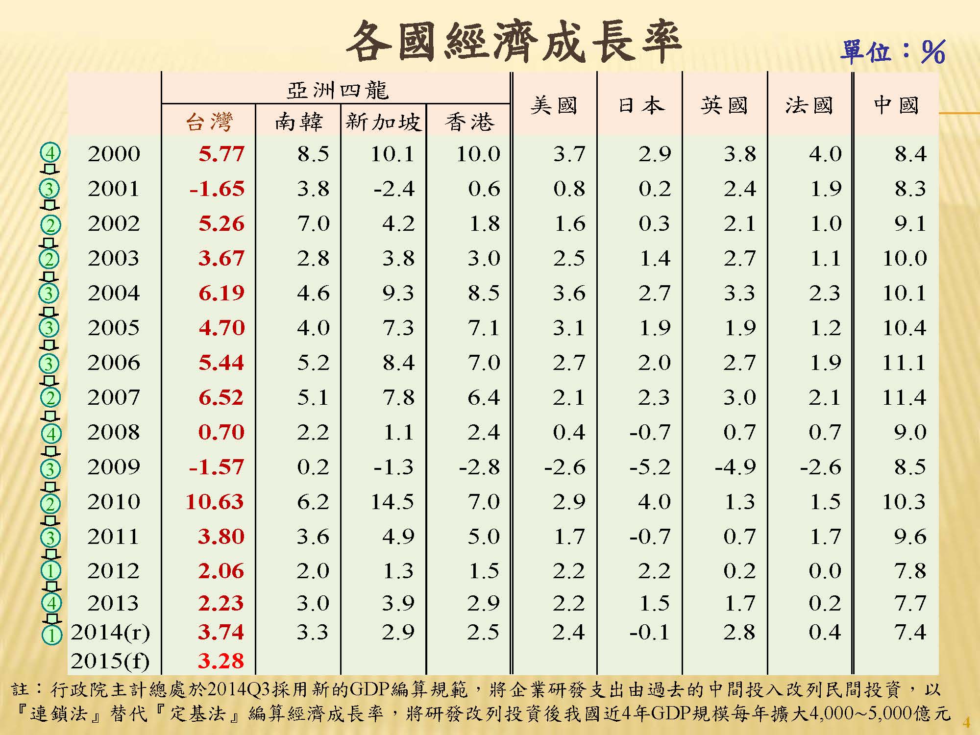 2009年金融海嘯後, 2010年又反彈到10.63%。經濟成長率不可以只有縱向的跟自己的前前後後比,如同2009年到2010年由-1.57%升到10.63%就沾沾自喜,新加坡比我們更好呢!應該是橫向的與同一期的各國經濟成長率比較。譬如2004年是6.19%,十分好!但在亞洲四小龍中只排行第三。最慘的2001年雖然是-1.65%,我們還贏新加坡呢!同樣受網路泡沫衝擊的新加坡仰賴出口比台灣高,高達40.9%,故受到的影響比我們更嚴重。