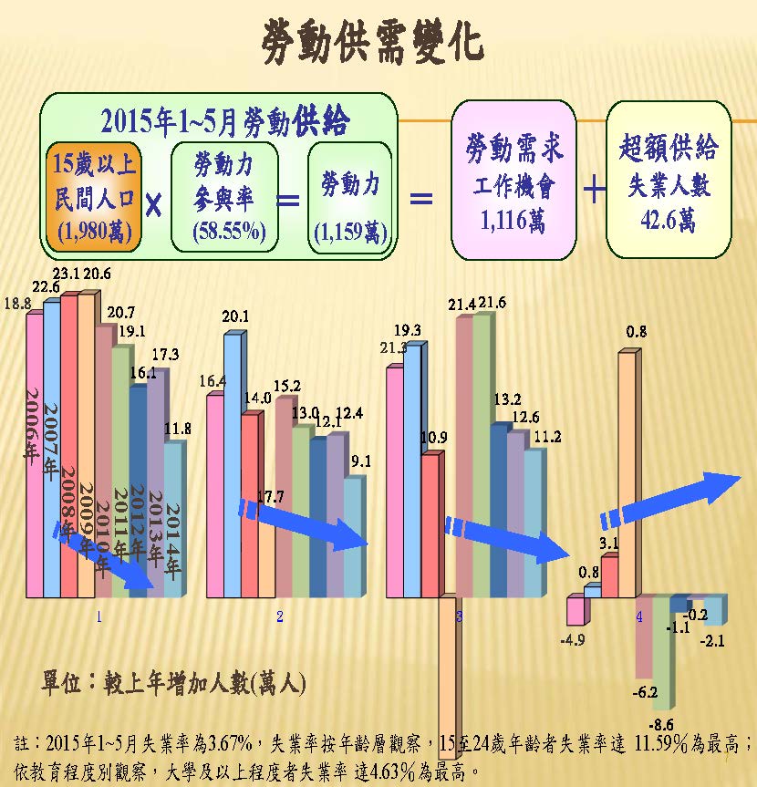 GDP分國內需求及國外淨需求,2014年國外的投資只佔GDP 10%而已,外資投資這幾年都在減少。而包括民間消費、政府投資的國內投資動能長期不足。投資動能長期不足原因是投資環境不夠好,再加上法令束縛太多,這需要持續改善。出口競爭力也在衰退,我們先從失業率談起…。