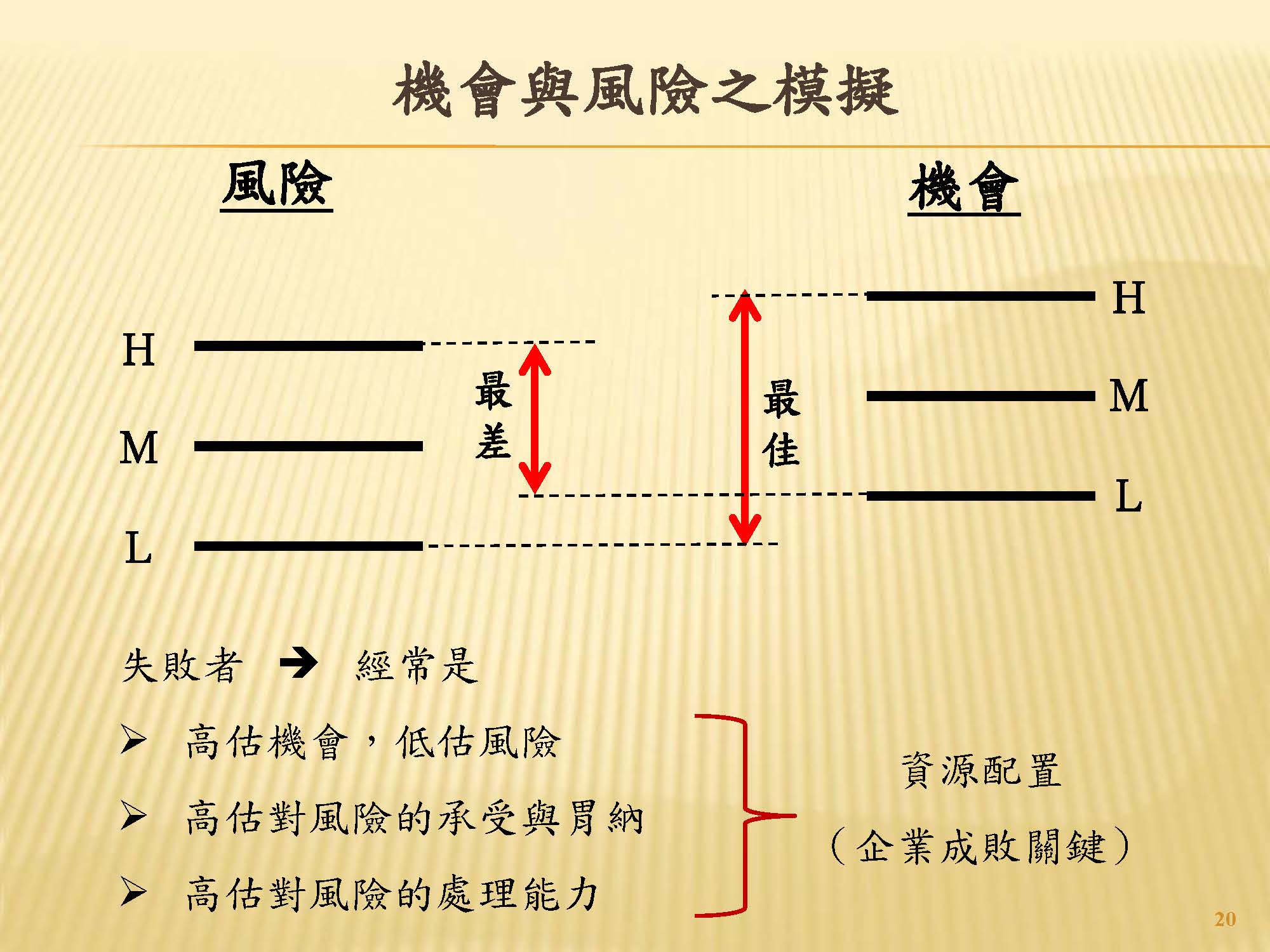 失敗者常是高估機會,低估風險,不但高估對風險的承受能力,又高估自己對風險的處理能力。對機會與風險估計錯誤(不論是高估或低估),都會造成損害。配置過度,會造成資源浪費,配置不足,有可能錯失商機。