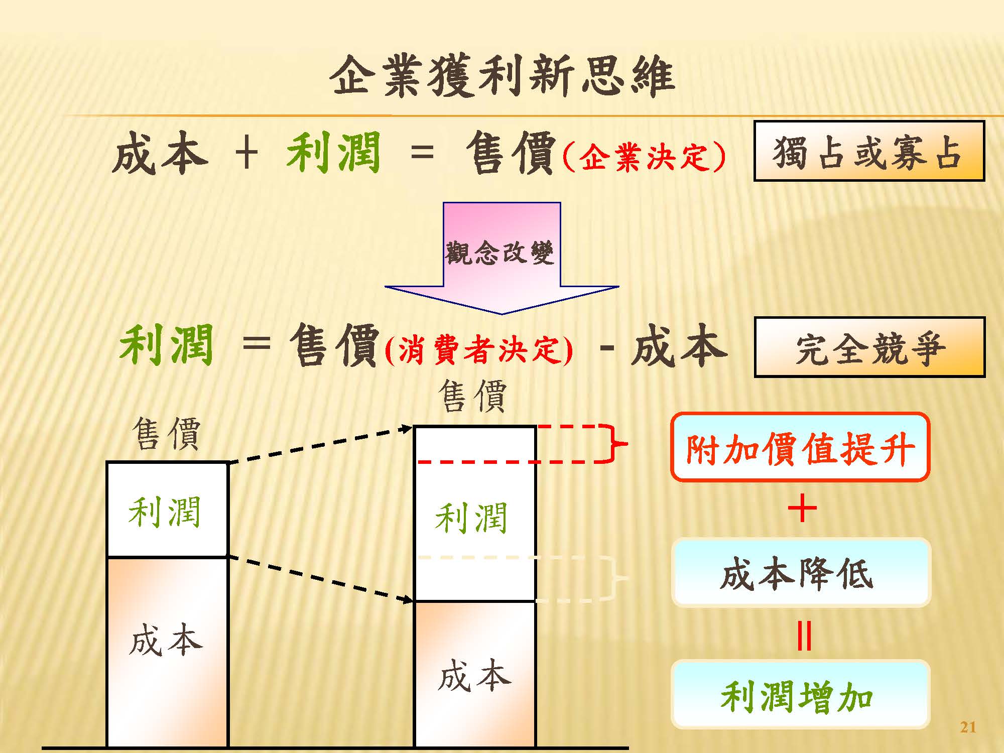 「成本+利潤 =售價」,這是獨占寡占事業的定理;但完全競爭的企業不是這樣子的,而是「利潤 =售價-成本」,售價是由市場決定的,所以必須把成本壓到售價以下,才有利潤。