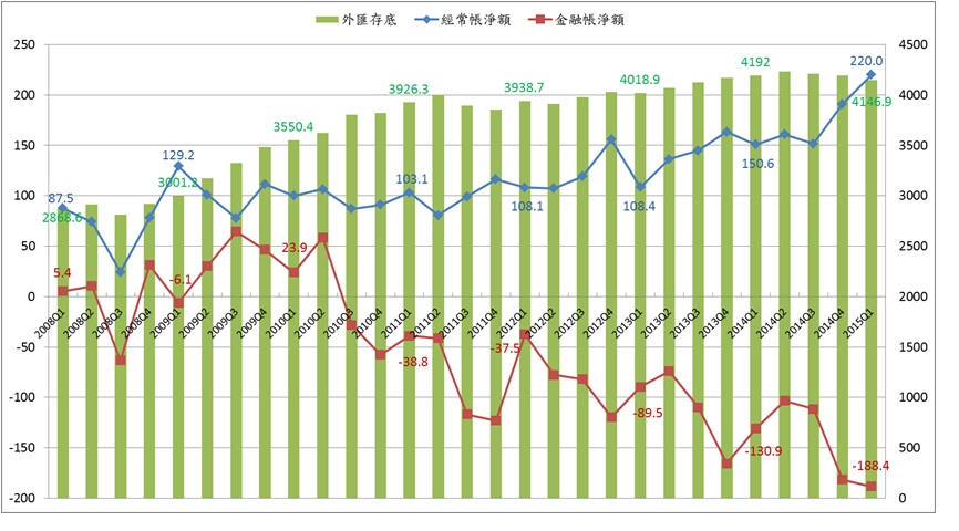 金融帳順差表示資金淨流入,代表國內投資機會多,金融市場活絡,能吸引外資前來投資,但台灣從2010Q3已經連19季金融帳逆差。