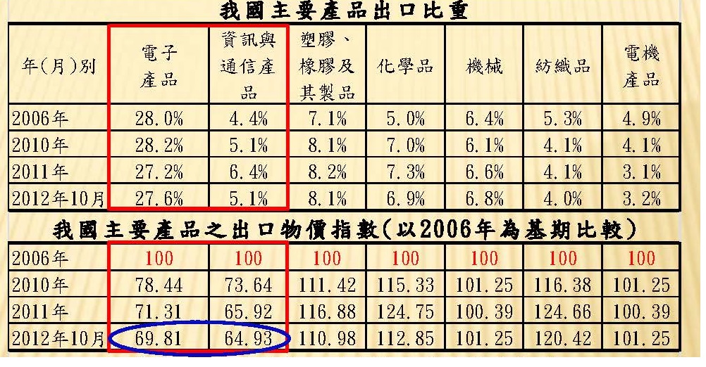 2.出口物價指數滑落:2006年出口可賣到100元的電子資訊產品,到了2012年只能賣到65元,價格年年滑落,表示競爭很激烈,殺價的很厲害;也因為關鍵零組件(Key component)及原材料要自外國進口,利基都被別人扼殺。售價跌了35%只是壓縮到我們自己的利潤而已。