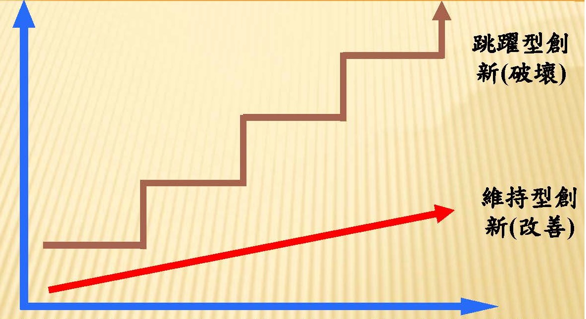 看上圖,大家知道紅色直線是「改善」~持續型創新,這是一定要做的,因為你的競爭對手也在持續改善。除此之外,你還是要追求一些跳躍式的、破壞性的「改革」(如上圖棕色階梯線),從材料、製程、設計、服務這些Business model 都可以創新。