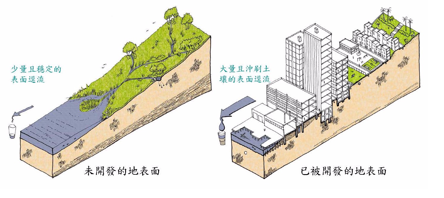 過去,土地是這樣,現在被建商開發成這樣。以前本來應該滲透到地底下的水,現在全跑到地面上來。錢被建商賺走,政府收爛攤子。我三年前交代營建署,都市計畫審議跟排水審議結合,建商要把土地開發成這樣,可以,一個條件,每一滴水都要留在集地裡,白話文講,叫海綿城市。