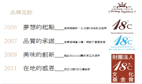 在我的品牌足跡裡面有兩三個LOGO,上面第一個類似有皇冠的感覺,是我跟我兒子第一個構思的商標, 因為那個皇冠中間好像是巧克力噴泉。旁邊有可可樹,左右兩邊有好像我們煮東西飄出來的香味。下面是feeling eighteen,中間加了一行中文字18度C低恆溫巧克力工房, 這個商標很快的半年內快速爆紅。 因為客人對我們品質的肯定, 網路訂購非常多。 很多客人到我那邊參觀就會問18°C的由來,我就告訴他們,這商標代表巧克力跟冰淇淋的溫度。真正的feeling eighteen是用巧克力18度以下,冰淇淋是 -18°C。 冰淇淋要好吃溫度要 -18°C, 再拉回來到12-13度, 柔軟度是最好吃的。冰淇淋正式上市後,又加了一個LOGO,同樣是18度C,用冰淇淋水晶顏色,也就是天空藍色來成為冰淇淋的LOGO。 結果這三個商標,在我要打出埔里進軍國際時造成我的困擾,所以幾年前我們找了奧美集團設計的質感很好的LOGO。2007-2009年間我又做了手工冰淇淋,在這個過程當中有個小插曲, 這個巧克力當初是我的小朋友他想要開,他當初說如果我考上台科大,爸爸你要教我經營巧克力。他在讀五專期間只要回到家就跟我學巧克力,他在高二升高三的時候就會自己做巧克力,常常帶去學校跟同學分享。我跟他說巧克力是個熱情的食材,你要把這個食材轉換為愛,用愛來做分享。所以每次送出去的巧克力要用歡喜的心去分享。做社會責任最簡單的表情就是微笑,所以他也懂得用巧克力做互動,後來他考上台科大就要求我實現承諾教他怎麼賣巧克力。 .