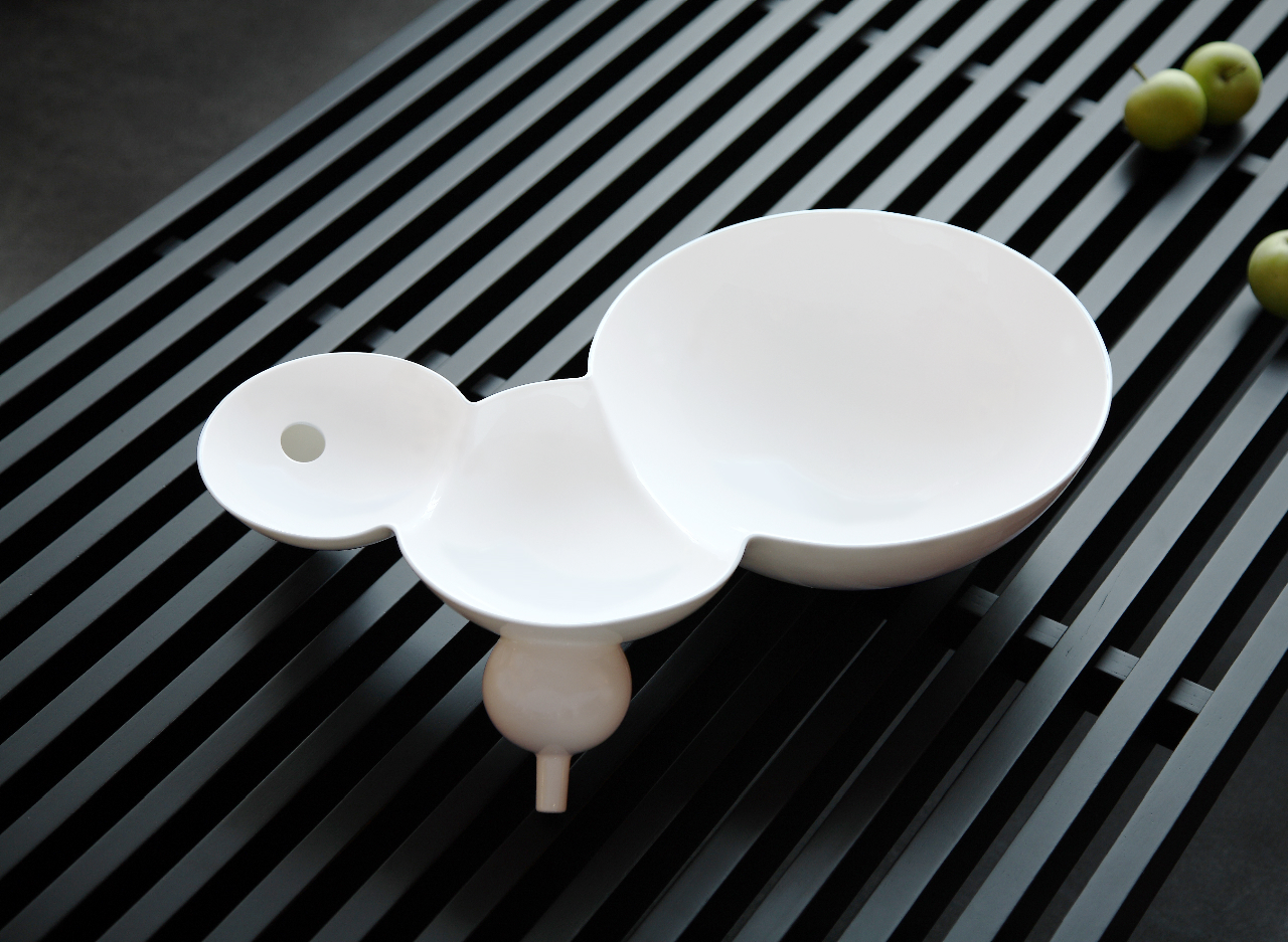 王俠軍老師提到,這個盤子當初是設計用來放水果,希望透過有巧思的陳設,把大自然的美好呈現在客廳。有許多人購買回去後,發揮天馬行空的創意,在大盤放了冰塊,小盤的洞裡插了枯樹枝,中盤則擺放生魚片,轉眼間就變成了一道時尚的懷石料理。也有人拿來裝湯圓,在盛食的過程中,一顆顆湯圓在盤中滾動,從大盤滑落到了中盤,再滑落到小盤…,美不勝收。器皿,不是個一成不變的東西,而是可以讓人發揮想像力,八方新氣希望打造一個讓每個人參與自己的生活、開創自己的生活的平台。