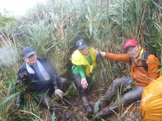尤其三芝竿尾崙山古道走小觀音山,下大屯溪古道,由300公尺一路仰攻到1050公尺,比宜蘭五峰旗的聖母山莊更艱難。當天下著毛毛細雨,路面鬆軟路滑,必須緊抓著兩旁細樹枝,才不會「巴庫」,快到山頂稜線還得花一個小時,穿過一大片比人高的箭竹林,好像毫芒人穿過一大片草原,也像小時候在甘蔗園裡捉迷藏一樣,體力迅速流失,體溫也在細雨與強風環伺慢慢下降,不得已躲在箭竹林內吃兩片土司補充體力。
