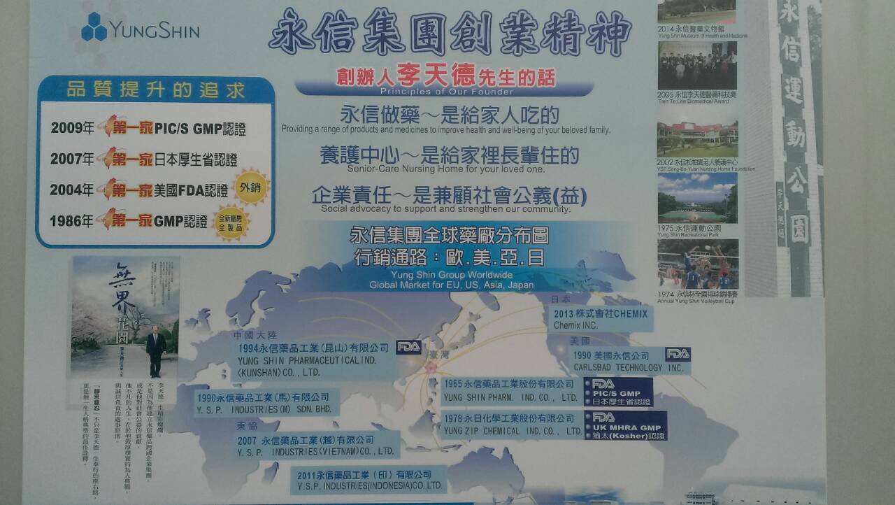 在廠區的許多地方,都可以看到永信集團創辨人的話。1952年,李天德先生成立了「永信西藥行」,經歷了60年,從一開始的代理批發,到現在海內外已有近十家子公司的規模,發展成現今的跨國集團。永信公司也是國內第一家通過GMP、第一家通過PIC/S GMP全廠認證的藥廠。營運範疇包含西藥、中藥、化妝品、健康食品及檢驗試劑之研發、製造、銷售及進出口貿易。接待人員一邊引導我們參觀廠區,一邊介紹關於藥品的相關資訊。