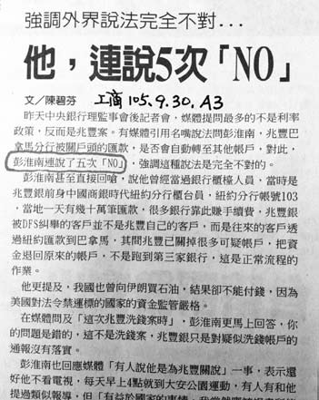依據媒體工商時報105-9-30報導有提到彭總裁稱:兆豐銀沒被㺯國科以涉及洗錢,只是美國規定申報表格項目疏忽理會未予申報,事後要求主事銀行主管高層出面解釋也未被遵重或理會才被美國主管官署科予重罰。基於美國國家安全考量,美國紐約金融監督機構持續必然祭出更嚴格的反恐反洗錢規定,因此紐約的台灣金融機構要因應作好美國BAS要求SAR通報的每個細節,站在人家土地上做生意當然要慎重處理,今後法律遵循成本是省不了,一定要納入金融業的經營成本。