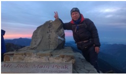 六月30日清晨2:30,吃過簡單的早餐後,全部登頂人員從山莊後山出發,每個人頭頂上都帶著一個LED燈,整個玉山頂部,由下往上看,月亮及星星就像掛在玉山頂峯上的大小水晶燈飾;每個人頭頂上的燈光在漆黑的夜晚中,由上往下看,形成一條長長不規則”之”字型的亮光,真是夜晚攀登玉山頂峰前的一個奇觀。由排雲山莊到玉山頂峰,高度是由3400多公尺到3952公尺只有500多公尺,路程是2.5公里,因此,從山莊一出發,就是爬坡而且坡度越來越陡,體力不好的或當日身体狀況不佳,這一段路可能就很吃力,甚至可能放棄。我們走到近山頂200公尺處是凌晨4:00,因天還未亮,就在那裡休息聊天直到天邊的曙光初露才一口氣的登頂,爬上頂峯,舉目所望景色,幾個月的努力鍛鍊終得一償宿願。