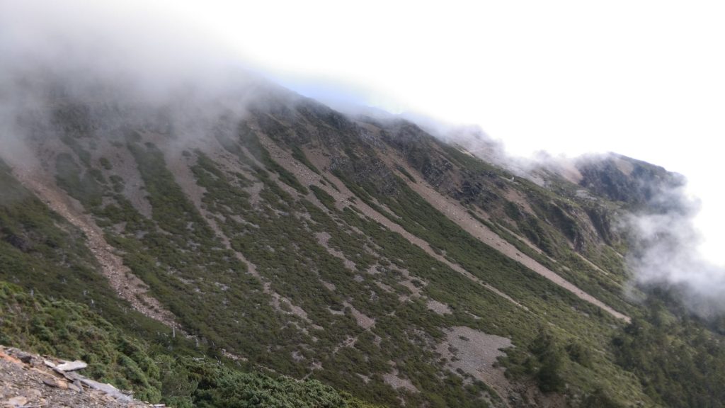在頂峰匆匆地拍了照,下山的時候約莫是下午五點,雲系氣流開始有了更明顯劇烈的變化,冷霧、降雨、落山風接連出現,此時也見識到了玉山帶給人類的考驗;但山景的瞬息萬變、忽而隱現的夕陽仍帶來了片刻的驚喜與我們的多次讚嘆!